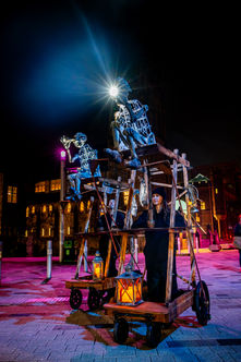Encounter illuminated astronomers charting imaginary skies. Ethereal cosmic characters, they are guardians of the stars, reading the night sky and conveying messages from the constellations. Seated in ramshackle chairs, high above their audience, they pedal through the sky, propelled by rods and mechanisms attached to the wheels. A unique roaming puppet act, with shadow puppetry experience included. Best suited to nighttime events, but daytime events are also workable.